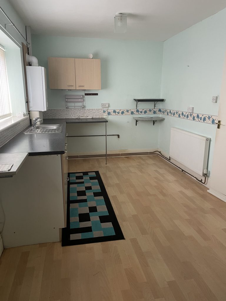 Kitchen: 4.56m x 2.68m (10’7” x 4’7”) (14’10 x 8’9) storage cupboards to wall & floor with stainless steel sink unit, plumbed for washer. Door to rear yard. Staircase to:
